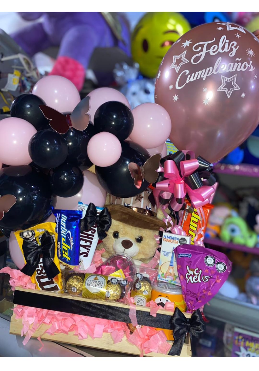 Cada diseño incluye una combinación única de peluches, dulces, licores, rosas y muchos más detalles encantadores.
