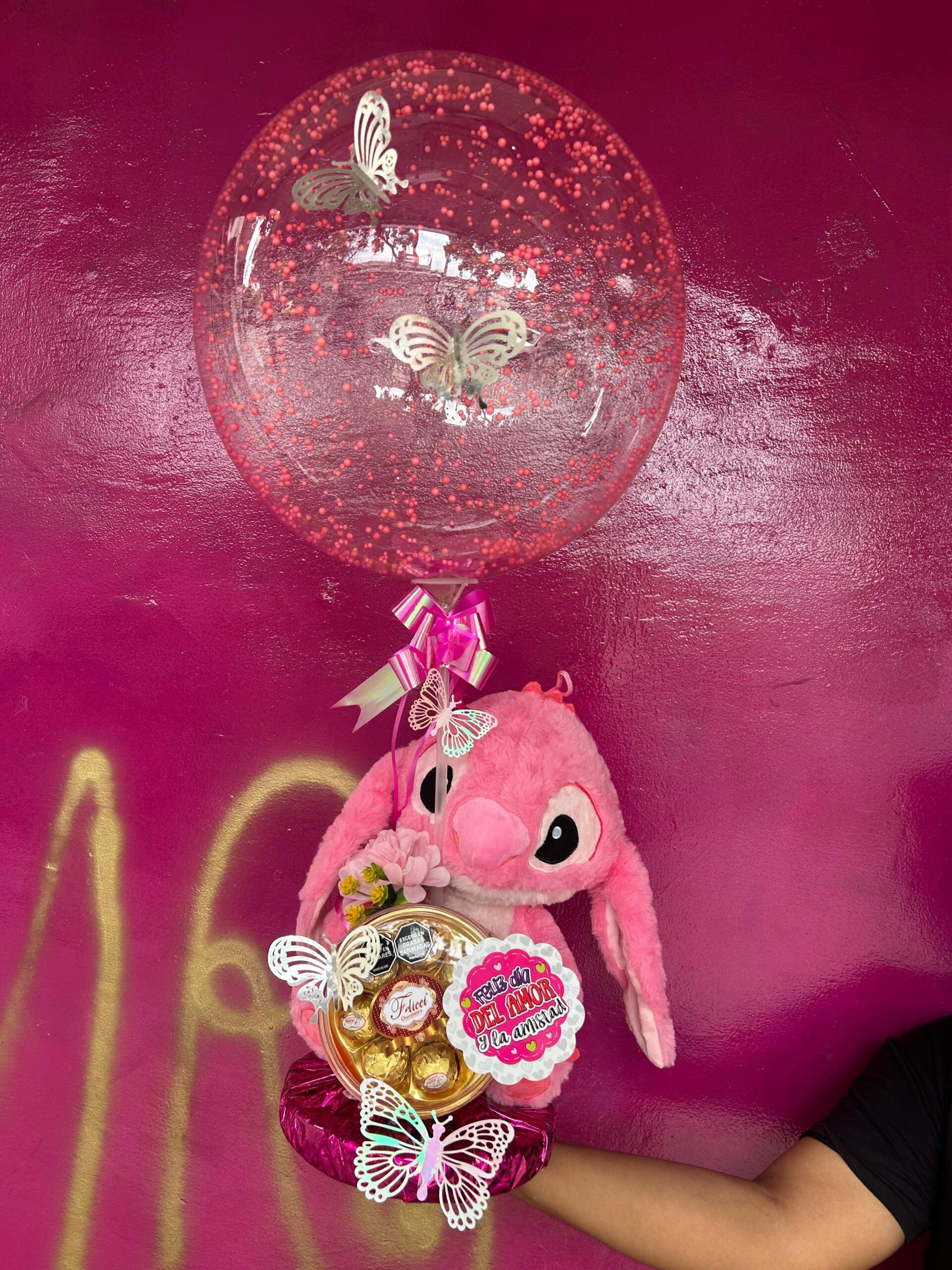 Cada diseño incluye una combinación única de peluches, dulces, licores, rosas y muchos más detalles encantadores.